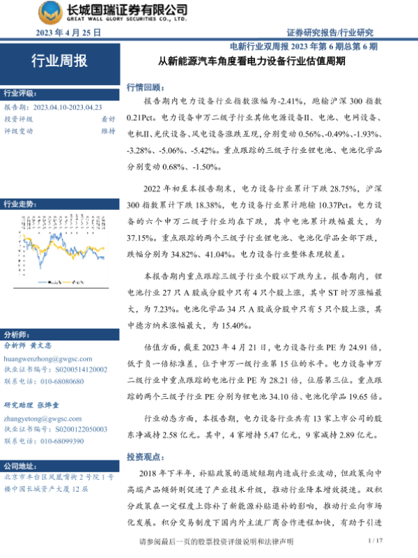 【长城国瑞证券】【20230425】20230425-长城国瑞证券-电新行业双周报2023年第6期总第6期:从新能源汽车角度看电力设备行业估值周期-17页 行业研究