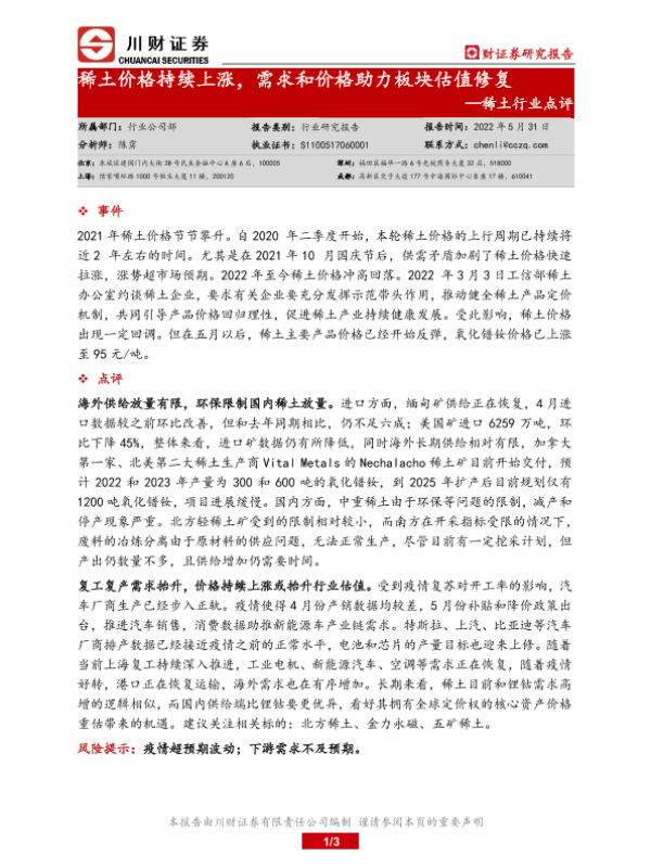 【川财证券】【20220531】稀土价格持续上涨,需求和价格助力板块估值修复-3页 证券期货研究报告