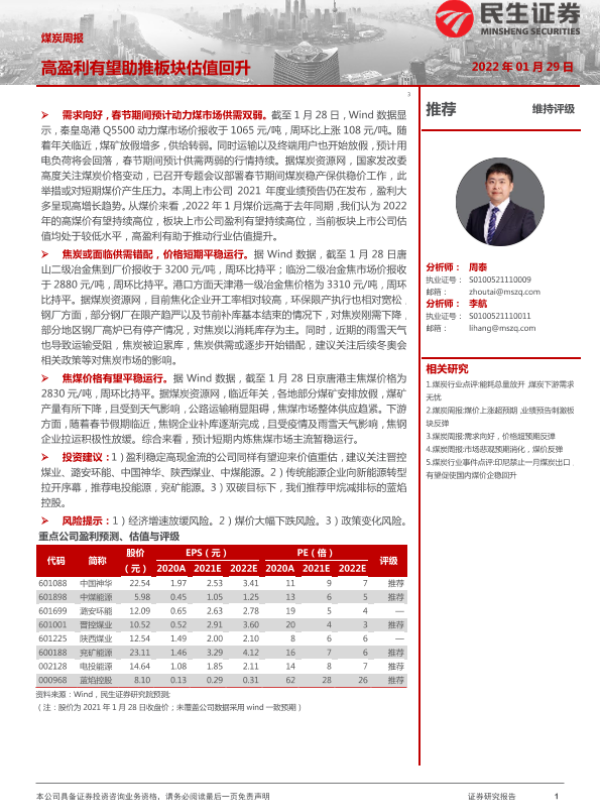 【民生证券】【20220129】20220129-民生证券-煤炭周报:高盈利有望助推板块估值回升-22页 行业研究