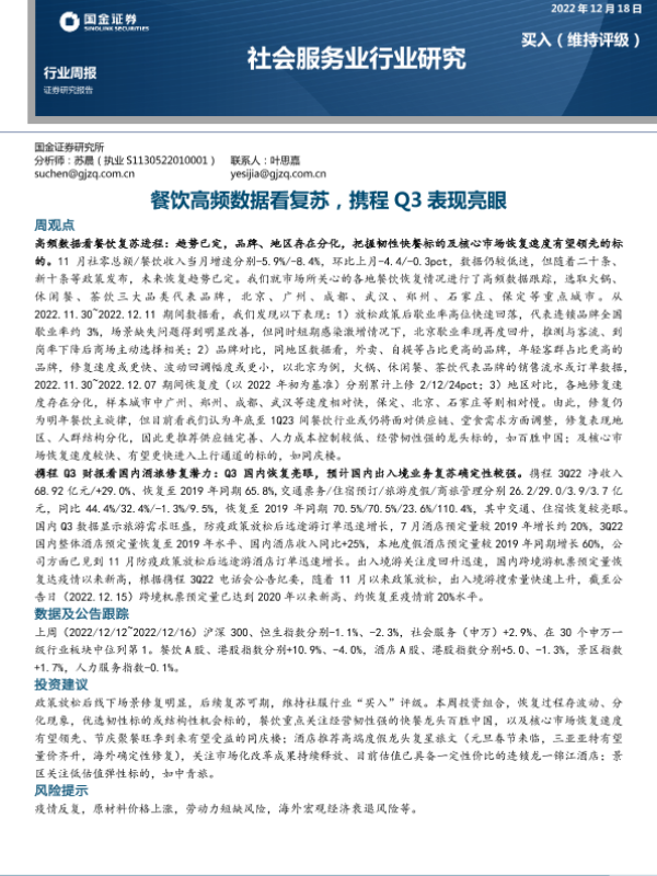 【国金证券】【20221218】餐饮高频数据看复苏,携程Q3表现亮眼-13页 行业研究