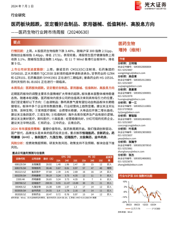 【光大证券】【20240701】医药生物行业跨市场周报:医药板块超跌,坚定看好血制品、家用器械、低值耗材、高股息方向-19页 行业研究