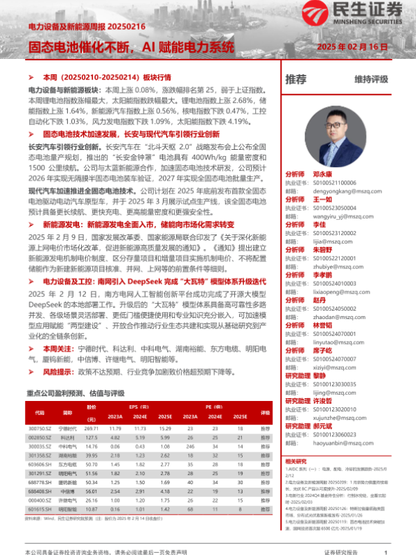 【民生证券】【20250216】电力设备及新能源周报:固态电池催化不断,AI赋能电力系统-23页 行业研究