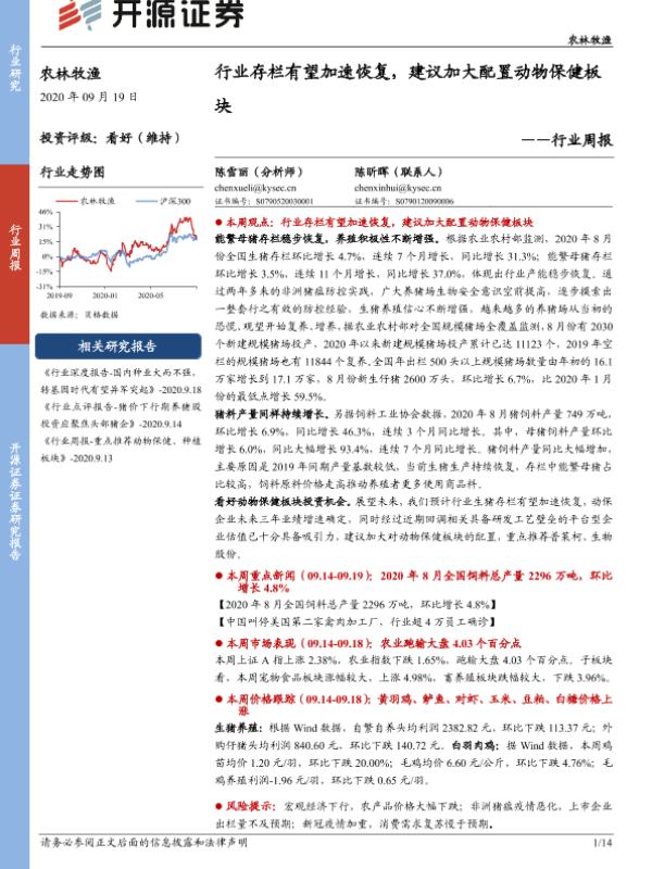 【开源证券】【20200919】农林牧渔行业周报:行业存栏有望加速恢复,建议加大配置动物保健板块-14页 行业研究