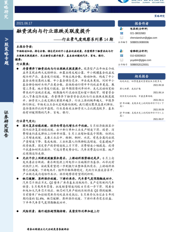 【国泰君安证券】【20210617】行业景气度观察系列第14期:融资流向与行业涨跌关联度提升-17页 行业研究