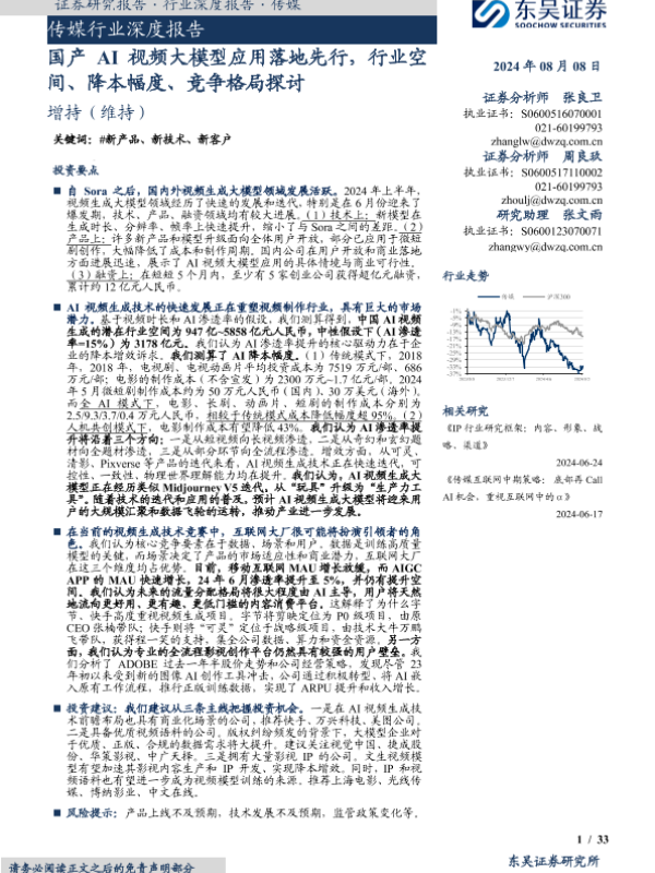 【东吴证券】【20240808】传媒行业深度报告-国产AI视频大模型应用落地先行-行业空间、降本幅度、竞争格局探讨-33页 行业研究