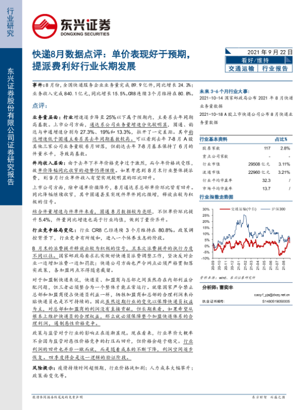 【东兴证券】【20210922】快递行业8月数据点评:单价表现好于预期,提派费利好行业长期发展-9页 行业研究
