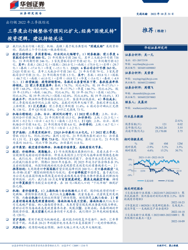 【华创证券】【20221031】交通运输行业出行链2022年三季报综述:三季度出行链整体亏损同比扩大,经典“困境反转”投资逻辑,建议持续关注-27页 行业研究