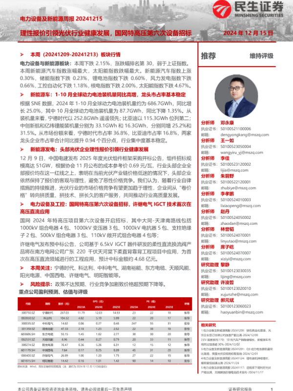【民生证券】【20241215】电力设备及新能源周报:理性报价引领光伏行业健康发展,国网特高压第六次设备招标-24页 行业研究