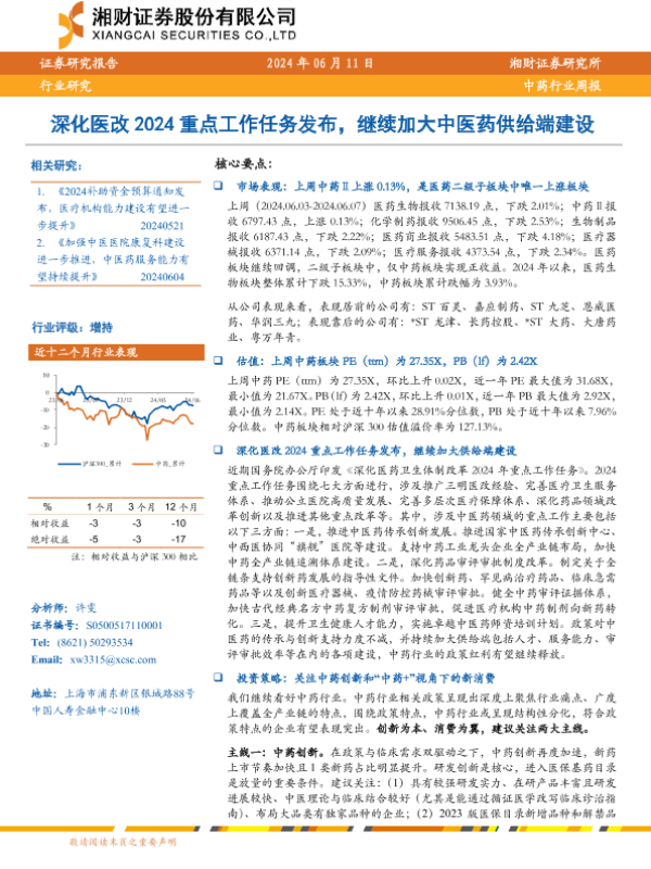 【湘财证券】【20240611】深化医改2024重点工作任务发布,继续加大中医药供给端建设-12页 行业研究