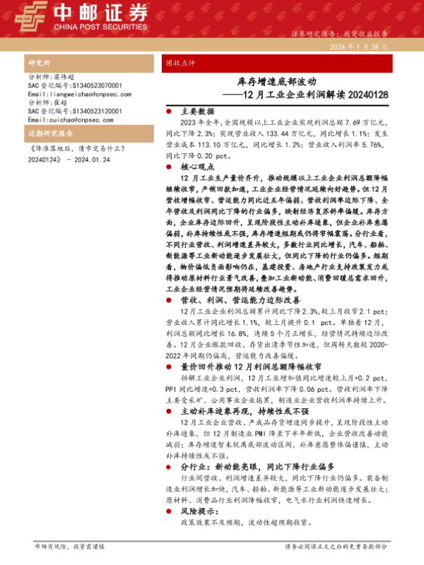 【中邮证券】【20240128】12月工业企业利润解读:库存增速底部波动-12页 行业研究