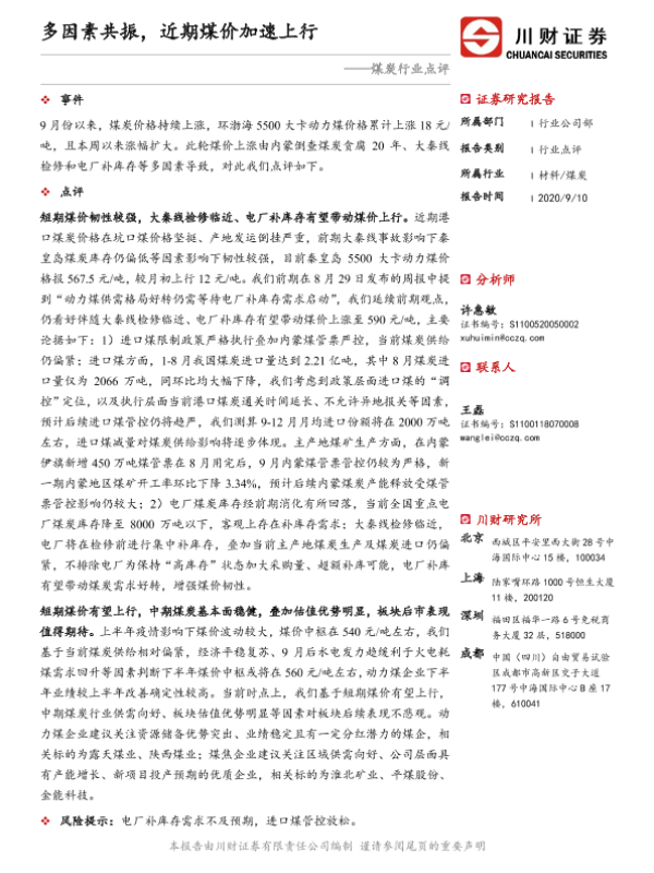 【川财证券】【20200910】煤炭行业点评:多因素共振,近期煤价加速上行-2页 证券期货研究报告