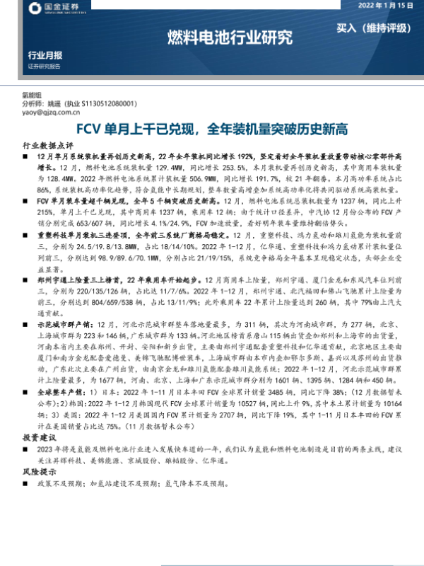 【国金证券】【20230115】燃料电池行业月报:FCV单月上千已兑现,全年装机量突破历史新高-12页 行业研究