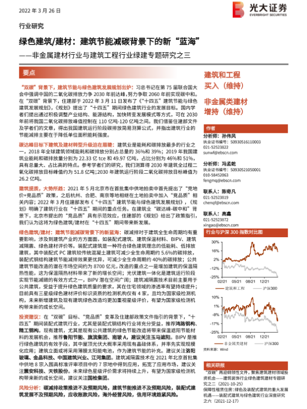 【光大证券】【20220326】非金属建材行业与建筑工程行业绿建专题研究之三:绿色建筑建材,建筑节能减碳背景下的新“蓝海”-42页 行业研究