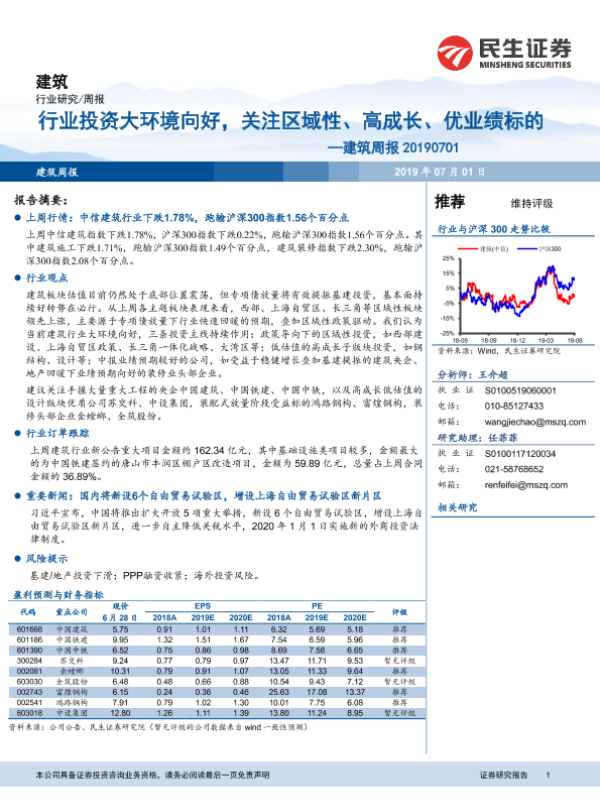 【民生证券】【20190701】建筑周报:行业投资大环境向好,关注区域性、高成长、优业绩标的-16页 行业研究