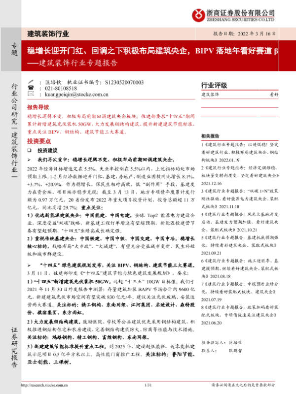 【浙商证券】【20220316】建筑装饰行业专题报告:稳增长迎开门红、回调之下积极布局建筑央企,BIPV落地年看好赛道β-31页 行业研究