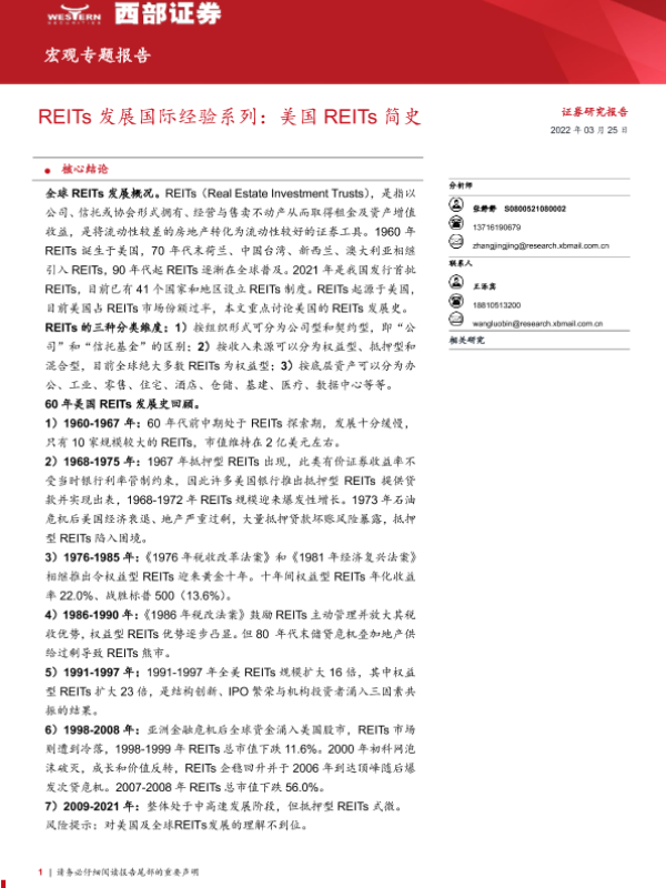 【西部证券】【20220325】宏观专题报告:REITs发展国际经验系列,美国REITS简史-18页 行业研究