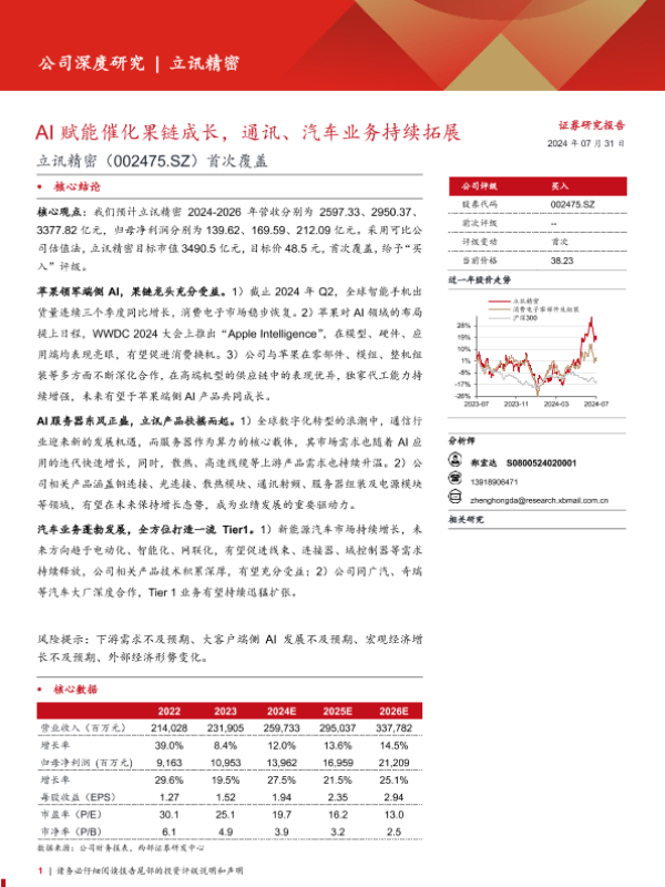 【西部证券】【20240731】立讯精密(002475)首次覆盖:AI赋能催化果链成长,通讯、汽车业务持续拓展-34页 行业研究