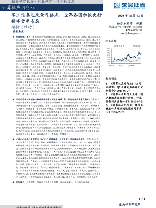 【东吴证券】【20200802】计算机应用行业:军工信息迎来景气拐点,世界各国加快央行数字货币布局-14页 行业研究