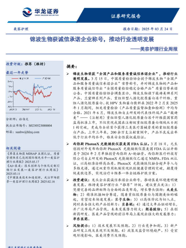 【华龙证券】【20250324】美容护理行业周报:锦波生物获诚信承诺企业称号,推动行业透明发展-10页 行业研究