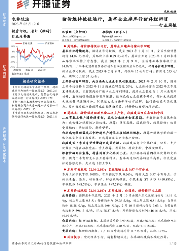 【开源证券】【20230212】农林牧渔行业周报:猪价维持低位运行,屠宰企业建库仔猪补栏回暖-13页 行业研究