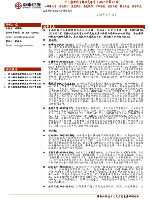 【中泰证券】【20220726】股专题研究报告(2022年第28期):维峰电子、信德新材、聚胶股份、嘉曼服饰、信科移动、宣泰医药、联影医疗、振华风光-44页 行业研究