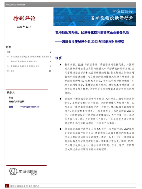 【中诚信国际】【20231206】四川省发债城投企业2023年三季度财报观察-11页 行业研究