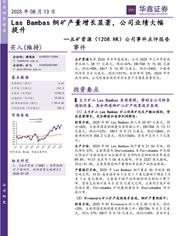 【华鑫证券】【20250813】五矿资源公司事件点评报告:Bambas铜矿产量增长显著,公司业绩大幅提升-6页 证券期货研究报告