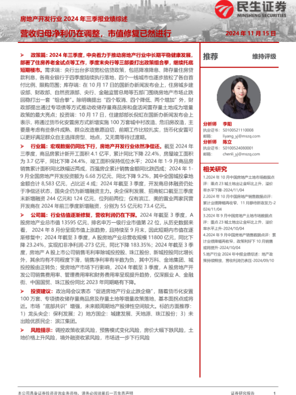 【民生证券】【20241115】房地产开发行业2024年三季报业绩综述-18页 行业研究