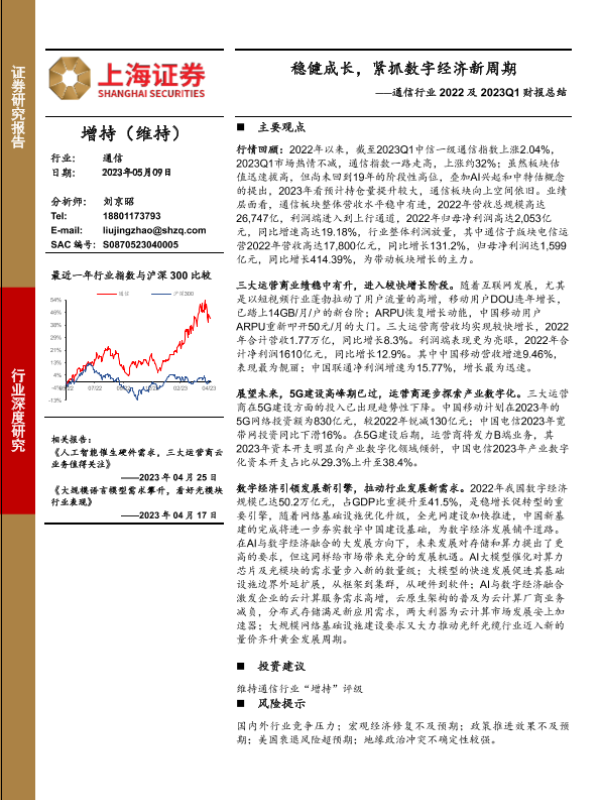 【上海证券】【20230509】通信行业2022及2023Q1财报总结:稳健成长,紧抓数字经济新周期-15页 行业研究