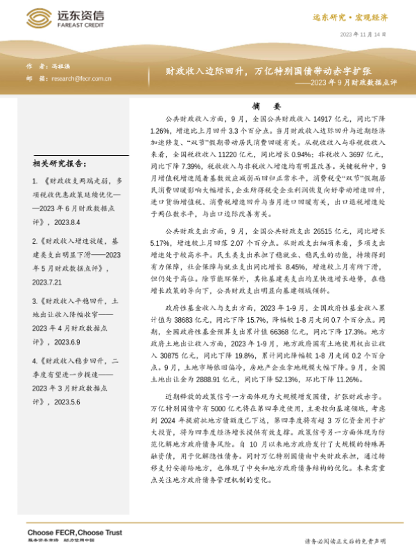 【远东资信】【20231114】财政收入边际回升,万亿特别国债带动赤字扩张——2023年9月财政数据点评-12页 行业研究