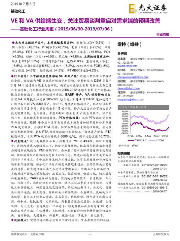 【光大证券】【20190708】基础化工行业周报:VE和VA供给端生变,关注贸易谈判重启对需求端的预期改善-19页 行业研究