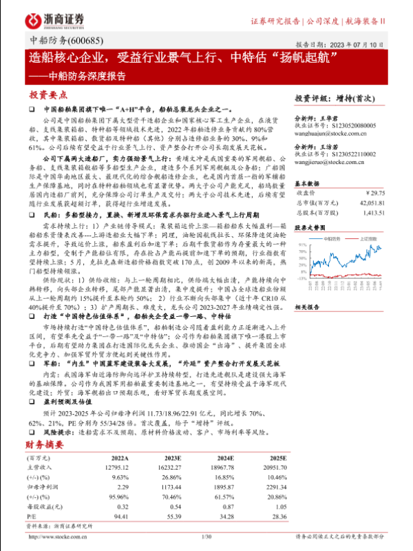 【浙商证券】【20230712】中船防务深度报告(600685):造船核心企业,受益行业景气上行、中特估“扬帆起航”-30页 行业研究