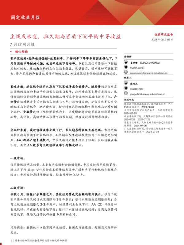 【西部证券】【20240805】7月信用月报:主线或未变,拉久期与资质下沉平衡中寻收益-20页 行业研究