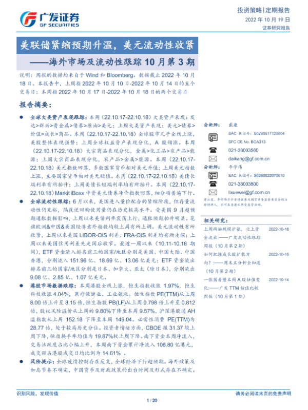 【广发证券】【20221019】海外市场及流动性跟踪10月第3期:美联储紧缩预期升温,美元流动性收紧-20页 行业研究