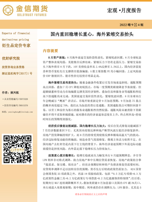 【金信期货】【20220904】宏观·月度报告:国内重回稳增长重心,海外紧缩交易抬头-24页 行业研究