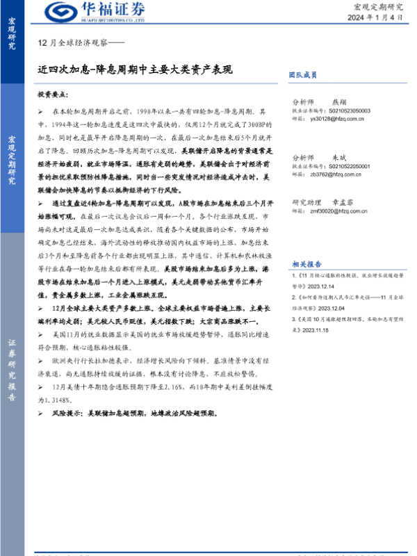 【华福证券】【20240104】12月全球经济观察:近四次加息-降息周期中主要大类资产表现-20页 行业研究