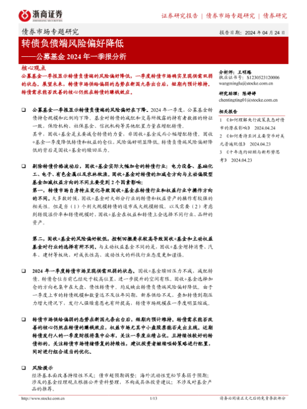 【浙商证券】【20240424】公募基金2024年一季报分析:转债负债端风险偏好降低-13页 行业研究