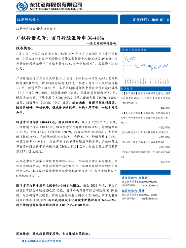 【东北证券】【20250710】固收转债分析-广核转债定价:首日转股溢价率36-41%-11页 证券期货研究报告
