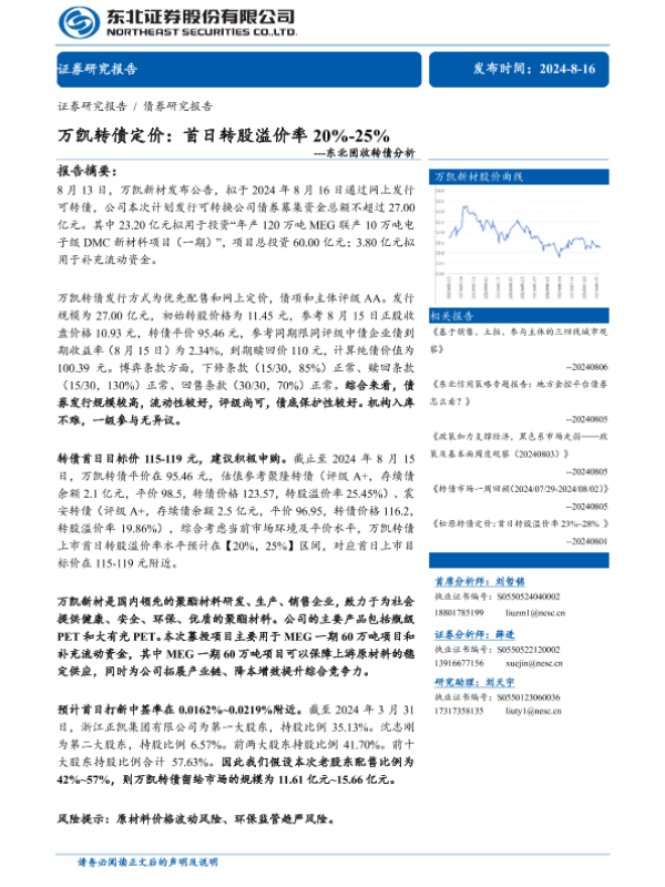 【东北证券】【20240816】固收转债分析-万凯转债定价:首日转股溢价率20%-25%-11页 行业研究