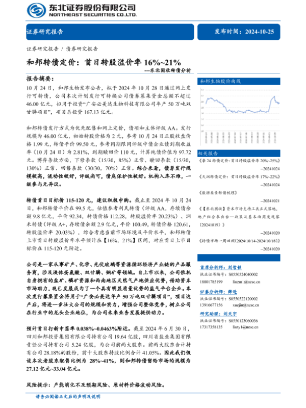 【东北证券】【20241025】东北固收转债分析-和邦转债定价:首日转股溢价率16%~21%-12页 行业研究