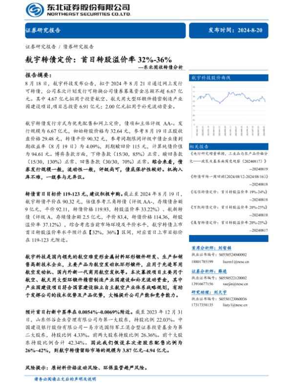【东北证券】【20240820】东北固收转债分析-航宇转债定价:首日转股溢价率32%-36%-11页 行业研究