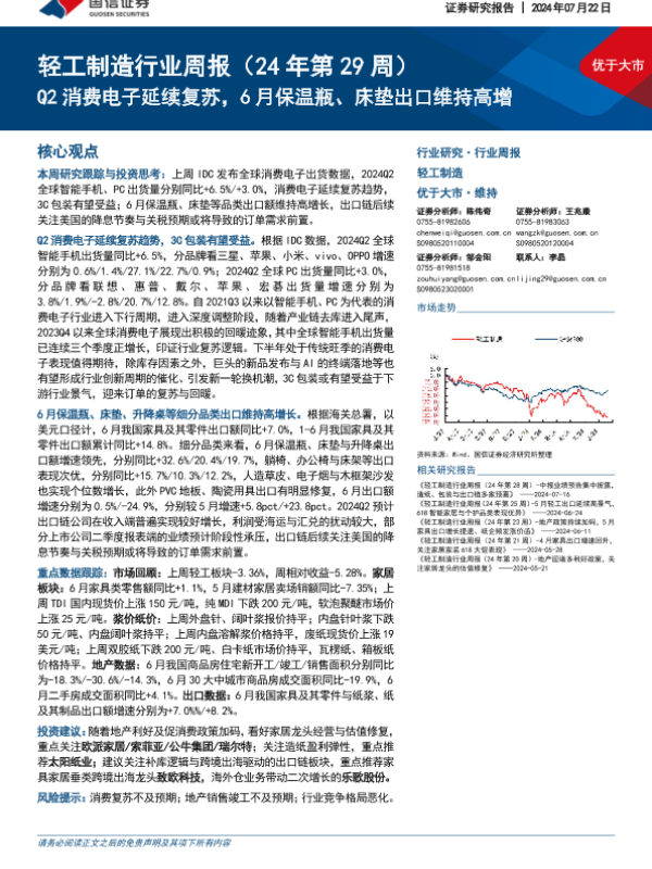 【国信证券】【20240722】20240722-国信证券-轻工制造行业周报(24年第29周):Q2消费电子延续复苏,6月保温瓶、床垫出口维持高增-18页 行业研究