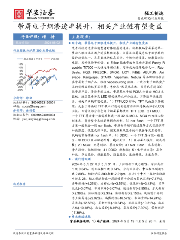 【华安证券】【20240602】20240602-华安证券-轻工制造行业周报:带屏电子烟渗透率提升,相关产业链有望受益-19页 行业研究