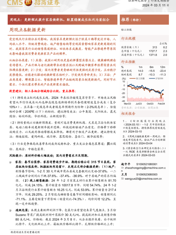 【海通证券】【20240311】20240311-招商证券-轻工纺服周观点&数据更新:周观点:更新频次提升家居焕新机,配置稳健成长红利为盾组合-42页 行业研究