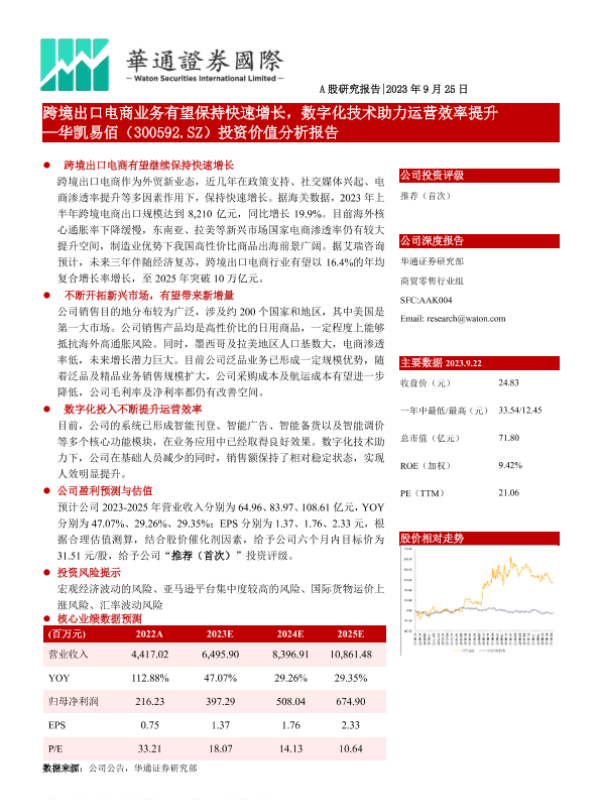 【华通证券国际】【20230925】跨境出口电商业务有望保持快速增长,数字化技术助力运营效率提升 —华凯易佰(300592.SZ)投资价值分析报告-20页 行业研究