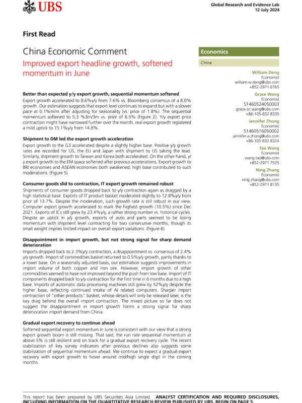 【UBS Securities Asia Limited】【20240712】China Economic Comment Improved export headline growth, softened momentum in June-8页 行业研究