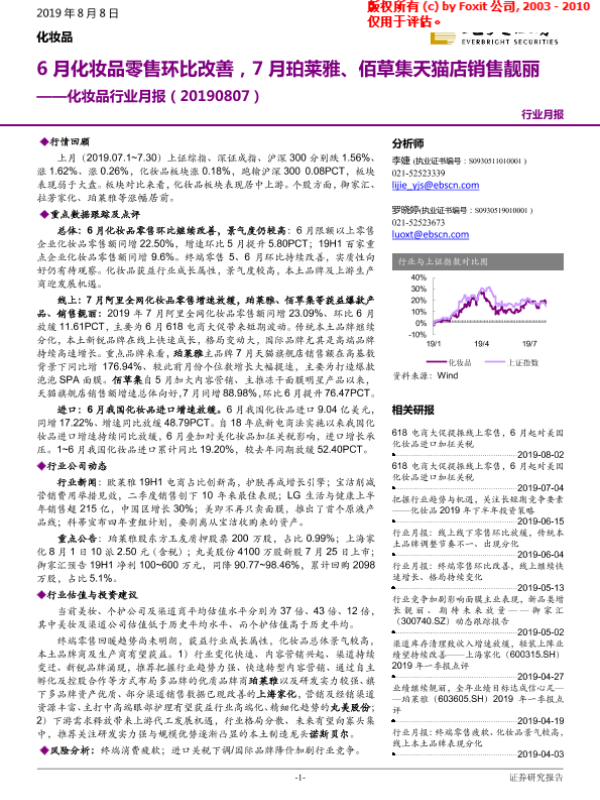 【光大证券】【20190808】化妆品行业月报:6月化妆品零售环比改善,7月珀莱雅、佰草集天猫店销售靓丽-19页 行业研究