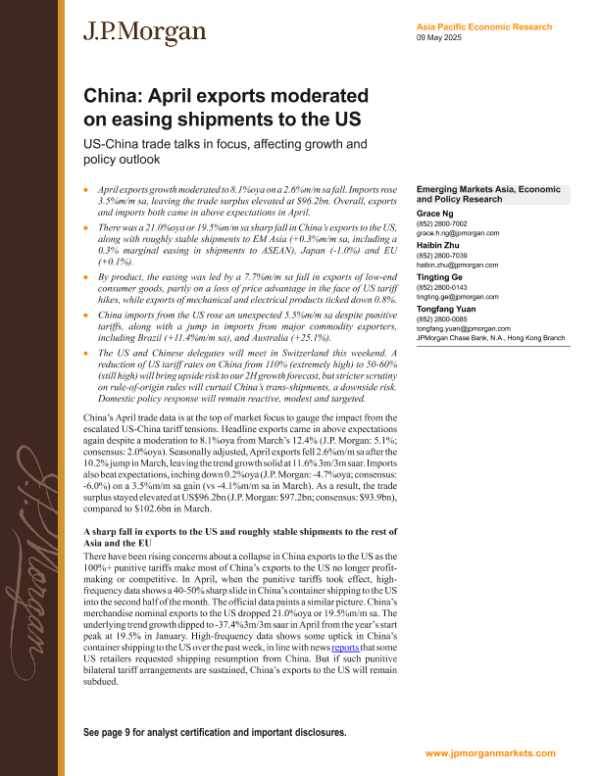 【J.P. Morgan】【20250509】FI-China April exports moderated on easing shipments to the US-13页 宏观策略
