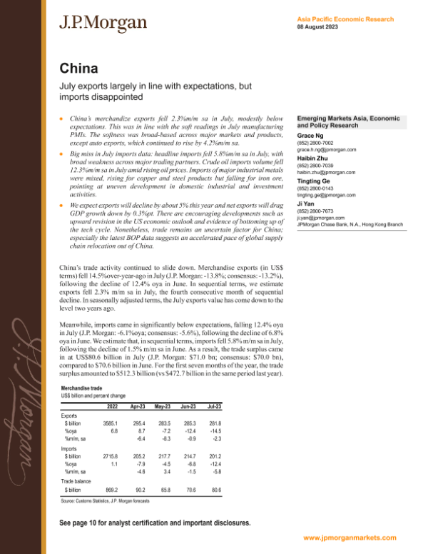 【J.P. Morgan】【20230808】中国7月出口大致符合预期,但进口令人失望-14页 行业研究