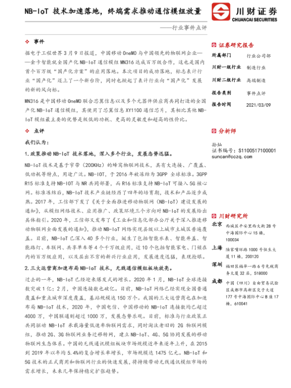 【川财证券】【20210309】NB-IoT技术加速落地,终端需求推动通信模组放量-3页 行业研究